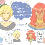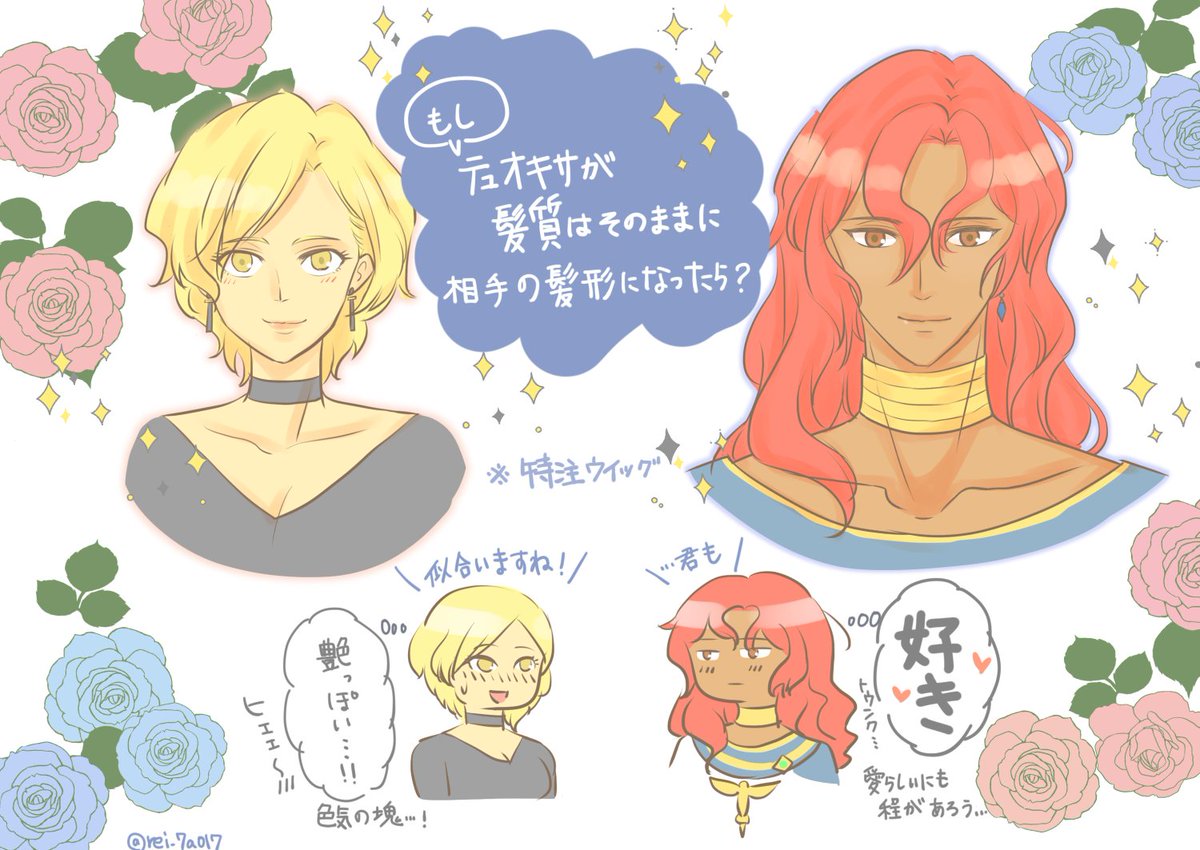 いつもと違う「髪型」 もしテュキが髪質はそのままに相手の髪型になったら?の妄想です。特注ウイッグを着けた相手の姿にお互いドキドキする二人🥰 これもツードロくらいで描きました…もはやお題に沿っているかも不明😅 #領民のワンドロワンライ