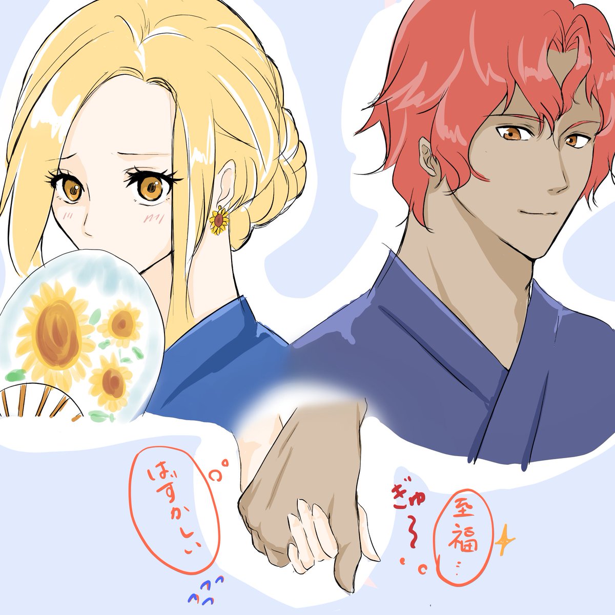 夏に咲く花🌻 「この花は君の色だな、キサラ」 「こっちはあなたの色ですよ、テュオ」 時間少しオーバーしちゃったけど参加してみたくて今回描かせてもらいました😌❤️赤い向日葵、あるんですよ……🌻 ワンドロ初めてでペース配分ムズカシカッタ……😂 #領民のワンドロワンライ