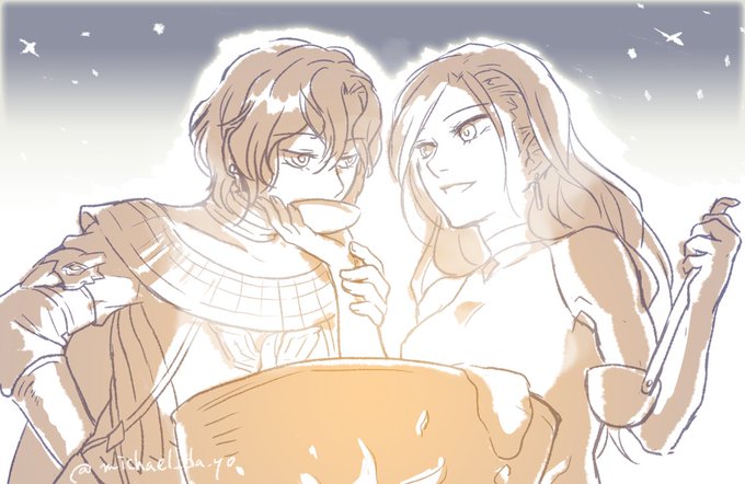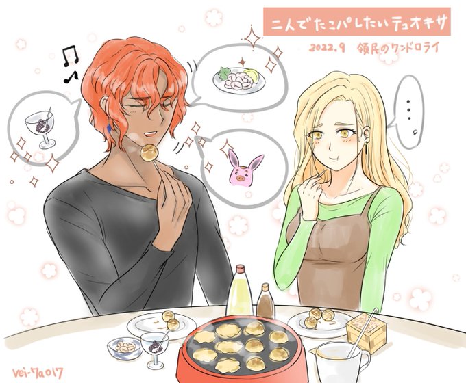 #領民のワンドロワンライ だいぶ遅くなりましたが9月のお題「二人で○○したい」で、たこパを楽しむテュキの絵です🐙「好きな具材を入れられることがたこパの醍醐味ですよ」と教わったテュは白子やキャビアを入れそう😅正直味は微妙だけど満足げなテュを見たらキもニッコリ笑顔になるでしょうね☺️