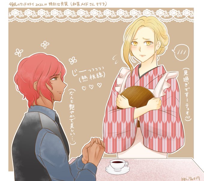 #領民のワンドロワンライ お題「特別な衣装」で女給服のキさんです☕️知り合いから頼まれて給仕の手伝いをする彼女を邪魔しないよう見守りに徹しようとしたものの、キの女給服姿に見惚れてガン見し過ぎて却って気を散らせてしまうテュ😅 和装メイド服は完全に自分の趣味です。