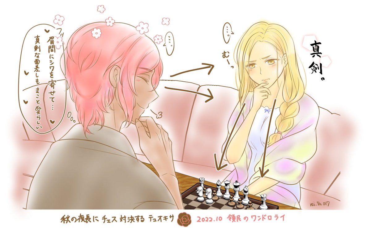 #領民のワンドロワンライ お題「秋の夜長」でチェスを指すテュキです。盤面を真剣に見つめるキをニマニマしながら見つめるテュ、でも勝ちは譲らない😏ルールミリ知らだけどテュは絶対チェス強いでしょ(確信) 負けず嫌いのキに「もう一戦手合わせ願います😫」と請われたら喜んで指南してあげそう~☺️