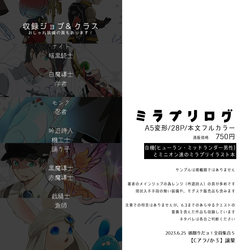 【6/25頭割り5新刊】 アリスブックス様の頒布ページができましたのでサンプルです。自機(ミドラン男性)のミラプリをまとめた本文フルカラーのイラスト本でミニオン等も描きました。6/21の20:00よりご予約開始です。宜しくお願い致します! alice-books.com/item/show/9991… #頭割り5準備中 #頭割り5作品URL