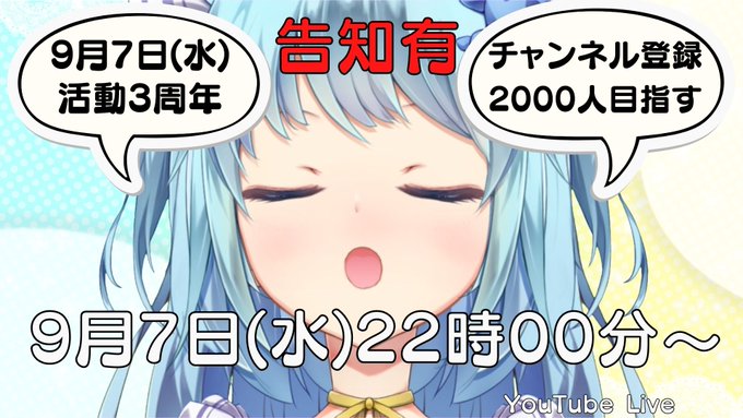 9月7日(水) 風渚こあは3周年を迎えます👏 この日までに 『チャンネル登録2000人』を 迎えたいです。皆様ご協力お願いします! まだまだ続く活動を見守っていただける 人はおりませんか!待ってます! #拡散希望 #風渚こあ #Vtuber夏の自己紹介祭り2022