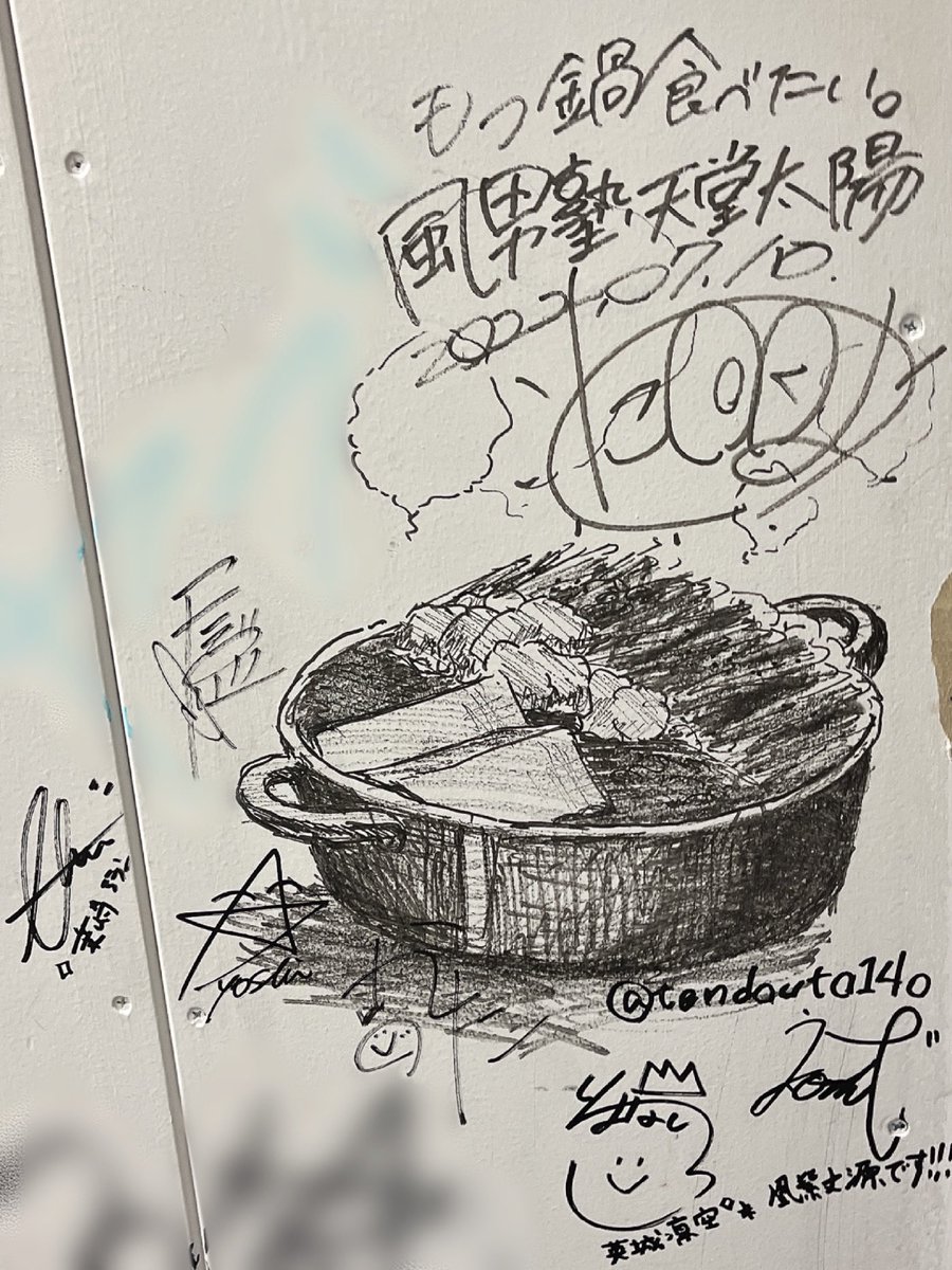 初めての九州・福岡でのライブ! 今までに経験したことない豪華な演出でめちゃくちゃ楽しかったー!!!!!!!🔥🎉 今日はサインを書いていい楽屋だったんだけど、「もつ鍋描いてよ~」って関汰くんのリクエストがあったので描きました🍋こちら(画像2枚目)太陽作もつ鍋です🍲 #GIRLSZONE #風男塾