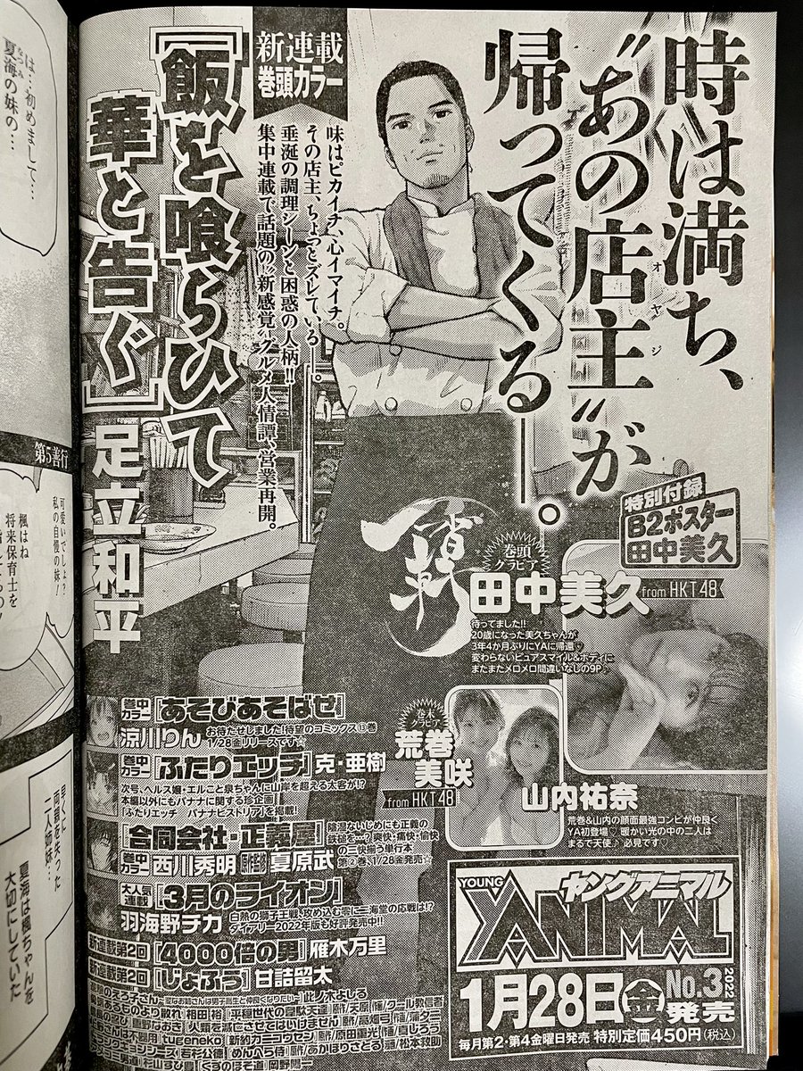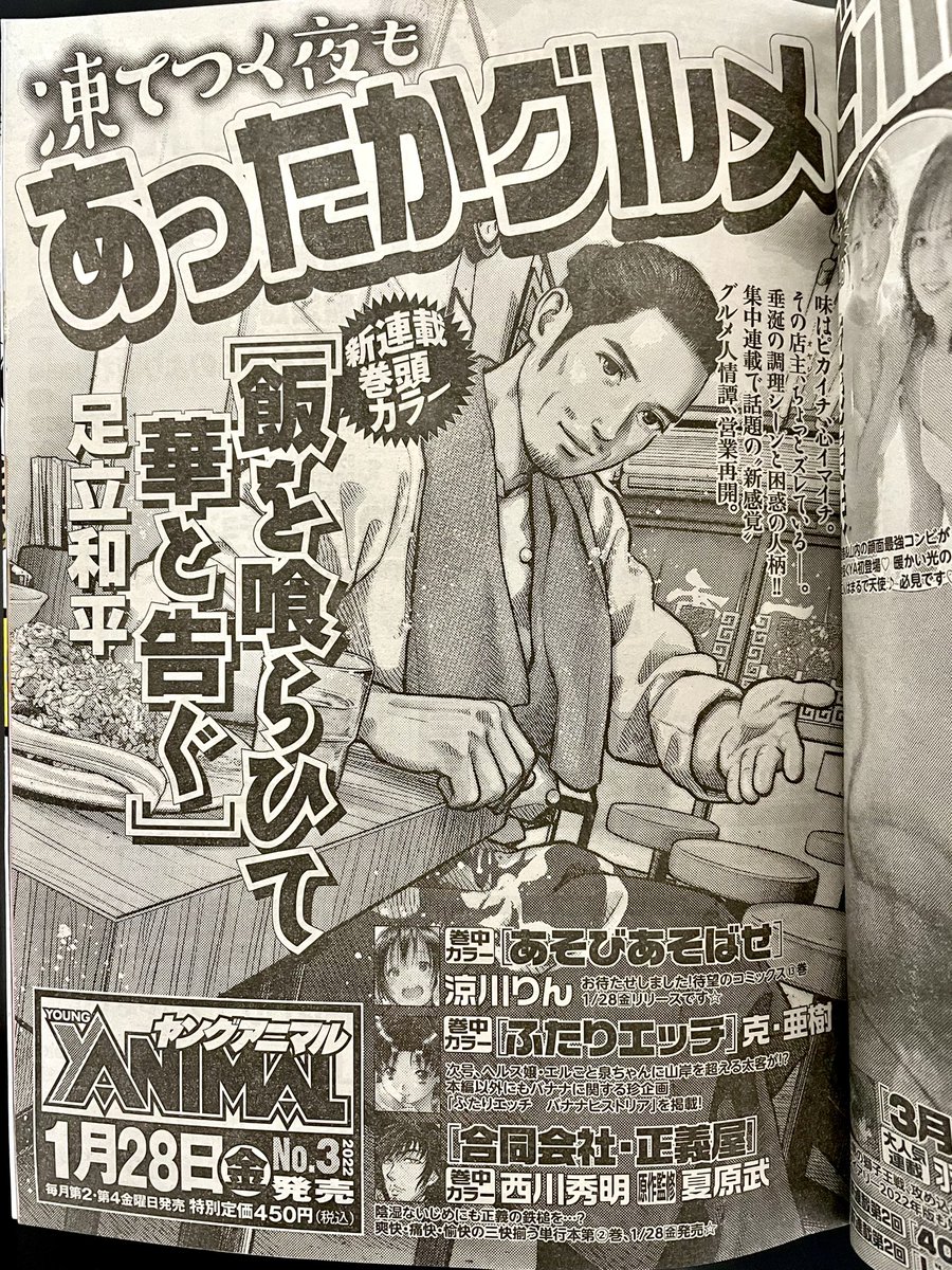 【初連載スタート❗️】 本日発売のヤングアニマルにて『飯を喰らひて華と告ぐ』の集中連載が始まります! 普通の料理漫画?違います! 是非読んで頂けたら嬉しいです! そして感想などはハッシュタグなどを付けてツイートしてもらえたら幸いです!✨ #飯華 #飯を喰らひて華と告ぐ #ヤングアニマル