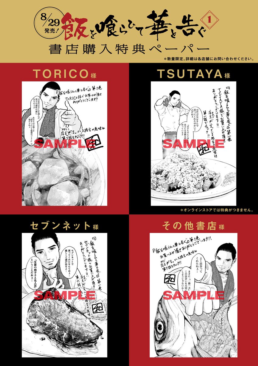 【告知!】 『飯を喰らひて華と告ぐ』の単行本第1巻が8月29日に発売されます! 先着で特典ペーパーが付く店舗もありますので、詳細は添付画像で要チェックやで!!💮 たくさん予約してもらえますように!🙏 #飯を喰らひて華と告ぐ #飯華 各書店でのご予約はこちらから hakusensha.co.jp/comicslist/639…