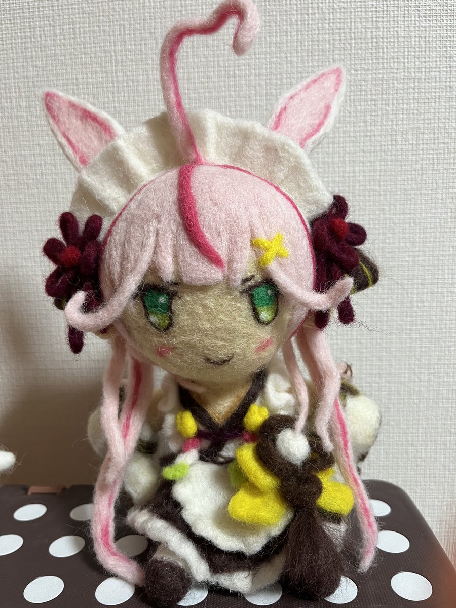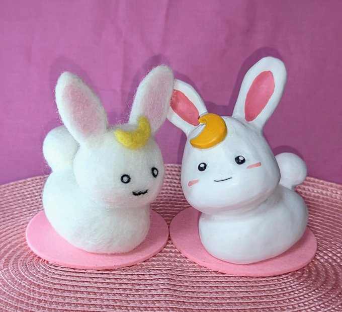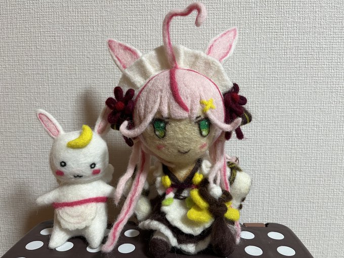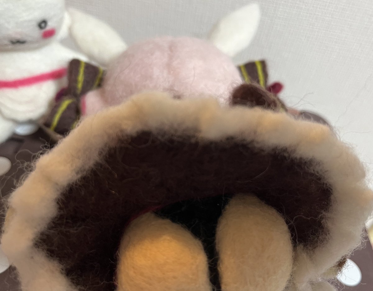 餅月なこさんのマスコット「おもち」 待機所でいつも餅たべてるのがかわいい 羊毛製の羽根は浮かせられる力がなかったので背中にくっつけました (ボトルガムはサイズ比較です) #餅月なこ #nacochi_Art #羊毛フェルト