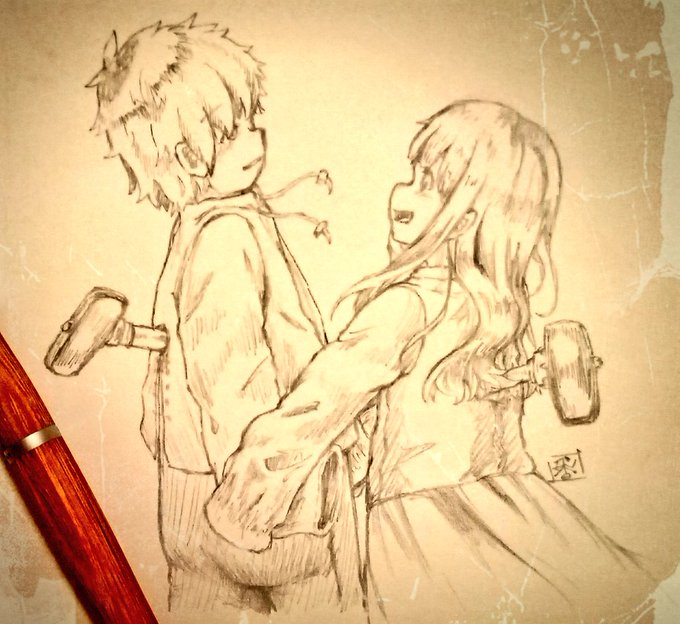 もぐ。(@mogu_marumegane)さんの創作の子[がらくたくん・からくりちゃん]を描かせていただきましたぁああ! 2人だからこその関係ですんごく好きです! かっわっいっいっ!!!_๑òωó)_ #香辛料シナモン #香モンに描かせて #絵描きさんと繋がたい