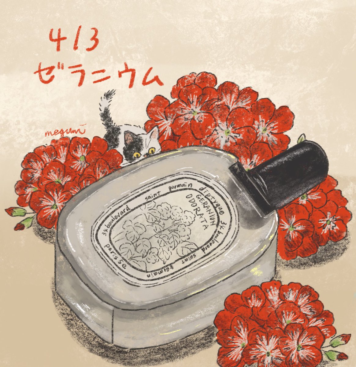 6月16日の誕生花はチュベローズです。花言葉は危険な戯れ グッチブルーム。この香水は容器が好きです。マットでぽってりした色が可愛い✨後スプレーが軽くてすごい細かいです #猫イラスト #イラストレーション #香水イラスト #夏の創作クラスタフォロー祭り #絵柄が好きって人にフォローされたい