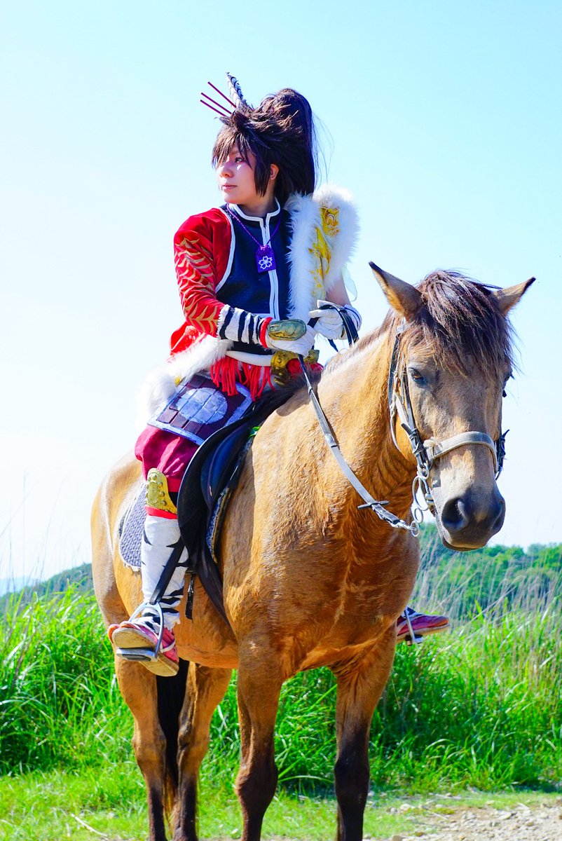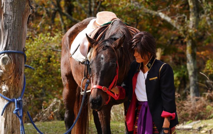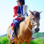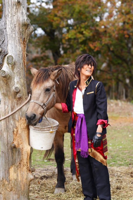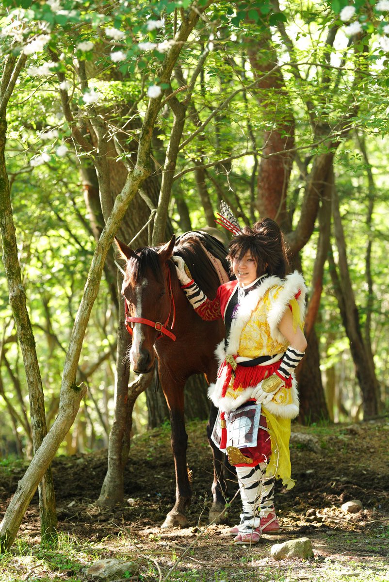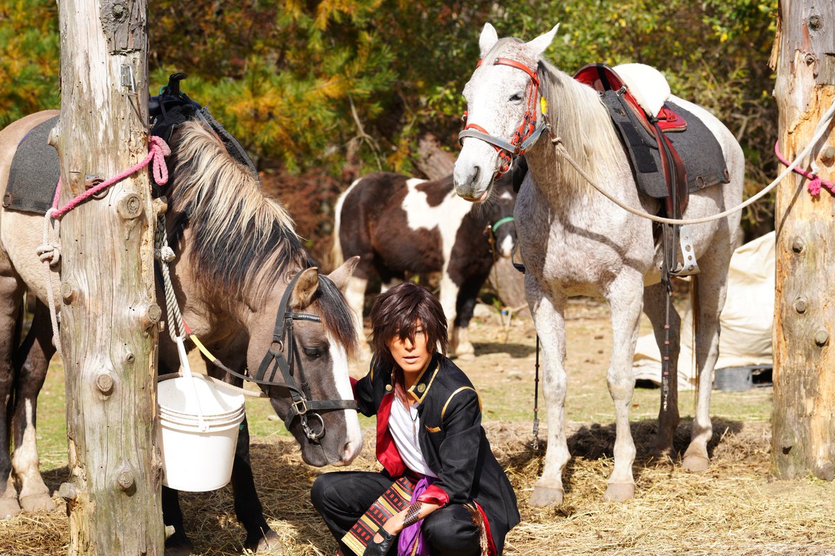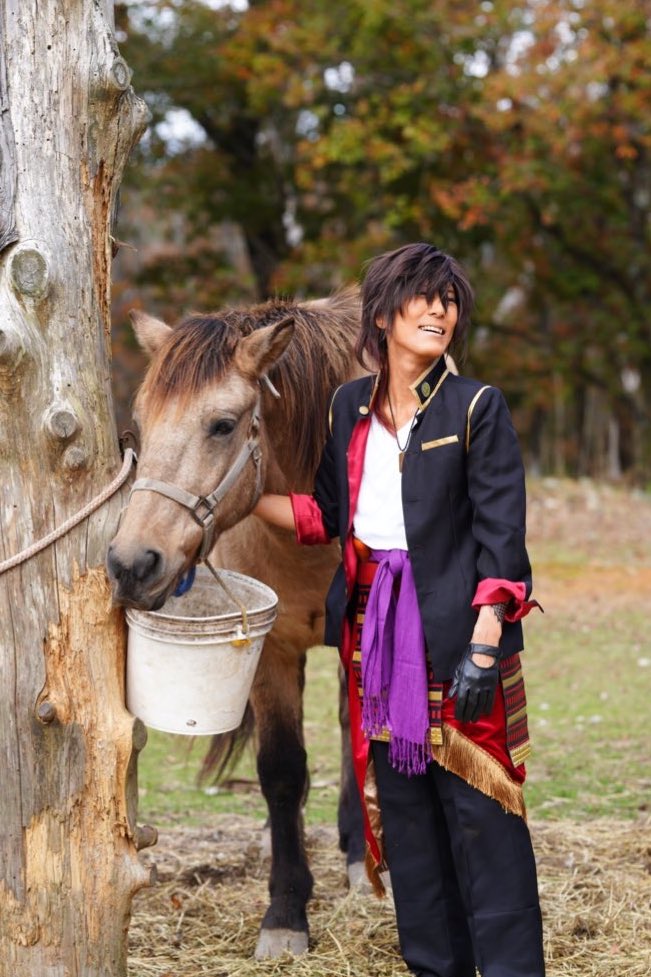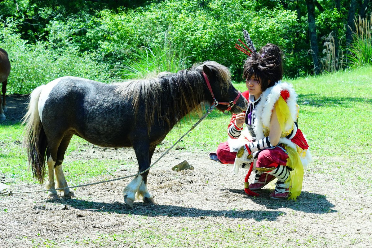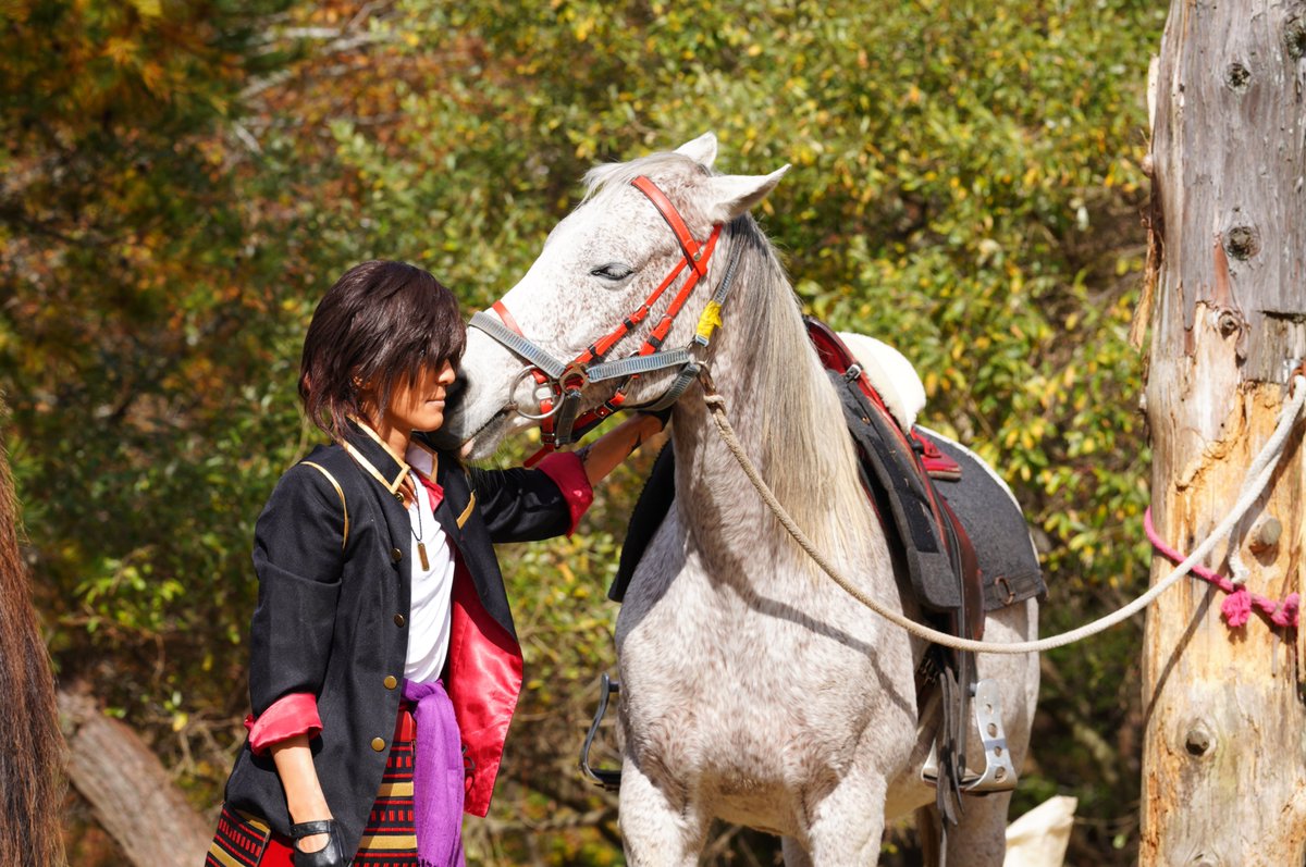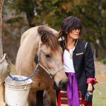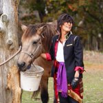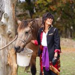 cosplay/刀剣/オフショ #レイヤーさんはコスプレの時のオフショットを晒して下さい お馬さん可愛くて、楽しくてただのワタシwww photographer @sakkun67 🐎ジュピター君 #大阪深山スタジオ #馬の山コス