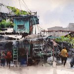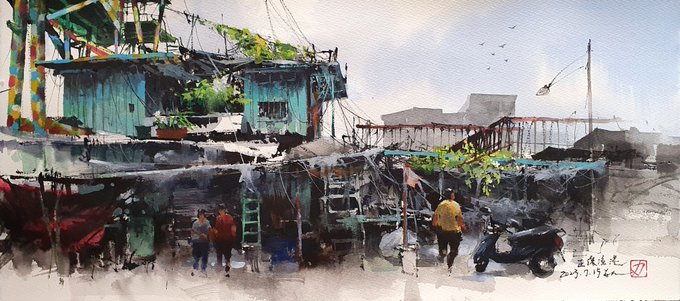 【板橋幸德市場】 (Banqiao Shinde Market) 年底總是最忙時刻,忙到沒時間寫生,抽空用油畫板撇一張水彩小品;油畫板有一層打底劑,不容易做出紙張層次的效果,因為這難度,這也是我用它來維持手感原因 #Watercolor #MISSION水顏 #馬可威水彩筆 #油畫板 #24x18cm