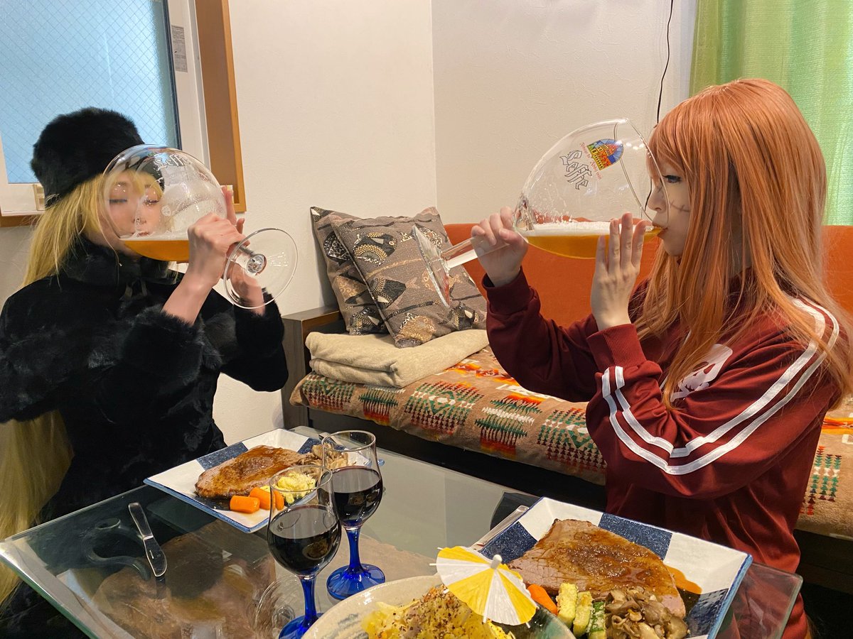 駄メーテルがビフテキ焼いてくれたわよー!付け合わせも完璧! ビアグラスちょっとサイズおかしくない??? 駄メラルダス @yuki_coss Photo📸: @KSK_FKD #エアコミケ #コスプレ #駄メーテル #駄メラルダス #メーテルの呑み鉄コス #ゆきとしずくの呑み鉄コス