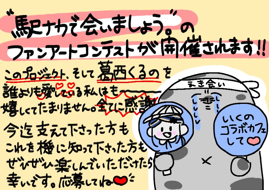 【お知らせ】 『#駅ナカで会いましょう。 』ファンアートコンテスト開催決定🎨🖌 色んな作品が見れたら嬉しいな。 沢山のご応募お待ちしております👀 📣期間:4/21(金)〜7/9(日)23:59迄 📣公式アカウントのフォロー&『#駅ナカファンアート』のタグ付け必須 その他の詳細は公式アカウントをチェック! twitter.com/ekinaka_pr/sta…