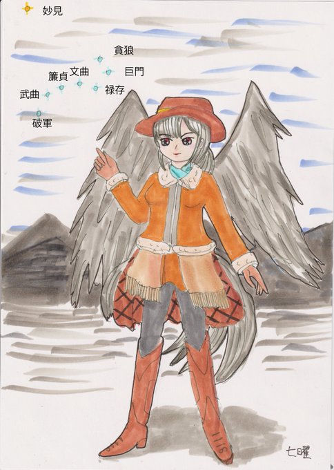 皇子様星を見ながら一緒に帰った頃が懐かしいですね。馬厩皇子は甲斐黒駒に乗り星を見ながら帰ったという伝説が有ります。 ※北斗七星を冬の配置で描いたので早鬼の衣装は冬服にしました。また星名は中国、日本の古語で書きました。 #東方の90分お絵描き #深夜の真剣お絵描き60分一本勝負 #驪駒早鬼
