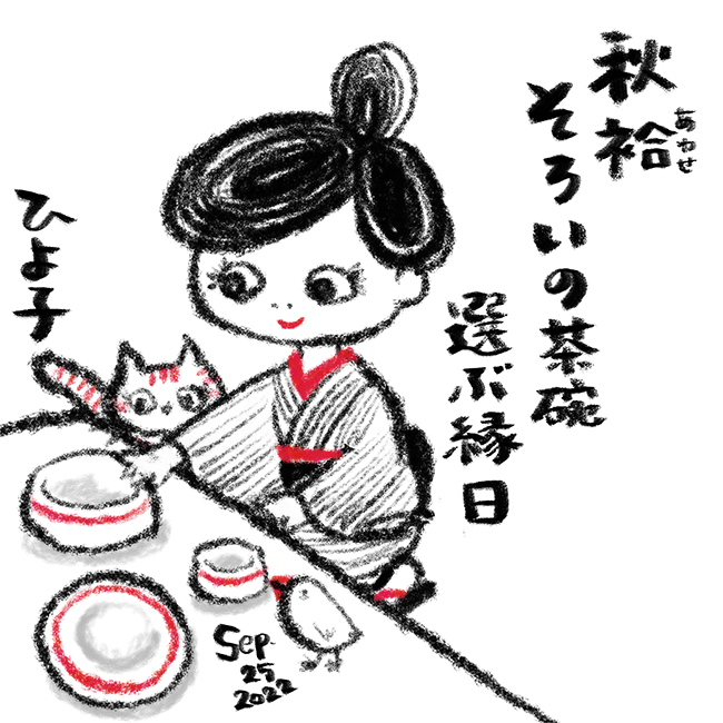 今日9/25は、#骨董の日 #スターリングシルバーの日。 毎月25日は、#天神の縁日 でもあるそうで。 袷の着物を着て出かけた骨董市で お揃いの食器を選ぶ様子が浮かびました。 #俳句 #秋袷 #haiku #AdobeFresco #赤と黒の絵日記 #イラスト #イラスト俳句 #絵描きさんと繋がりたい