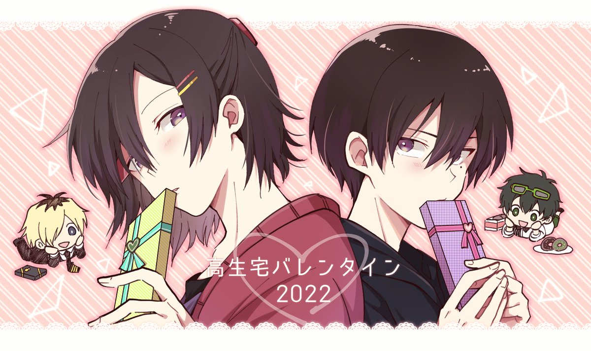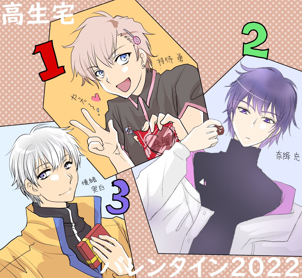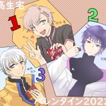 チョコお渡ししました🍫 持待勇→見た目イケメンなのに性格が悪いのにおもろいっていう。蛾と踊るも良いけど君の呼ぶ声とオリカミほんと最高。 奈降充→ほんとエロい人だよ… 懐緒実白→一人称僕なのと喋り方好き。2人の掛け合い美味しい。 (垢変更したので再掲) #高生宅バレンタイン2022 #高生宅