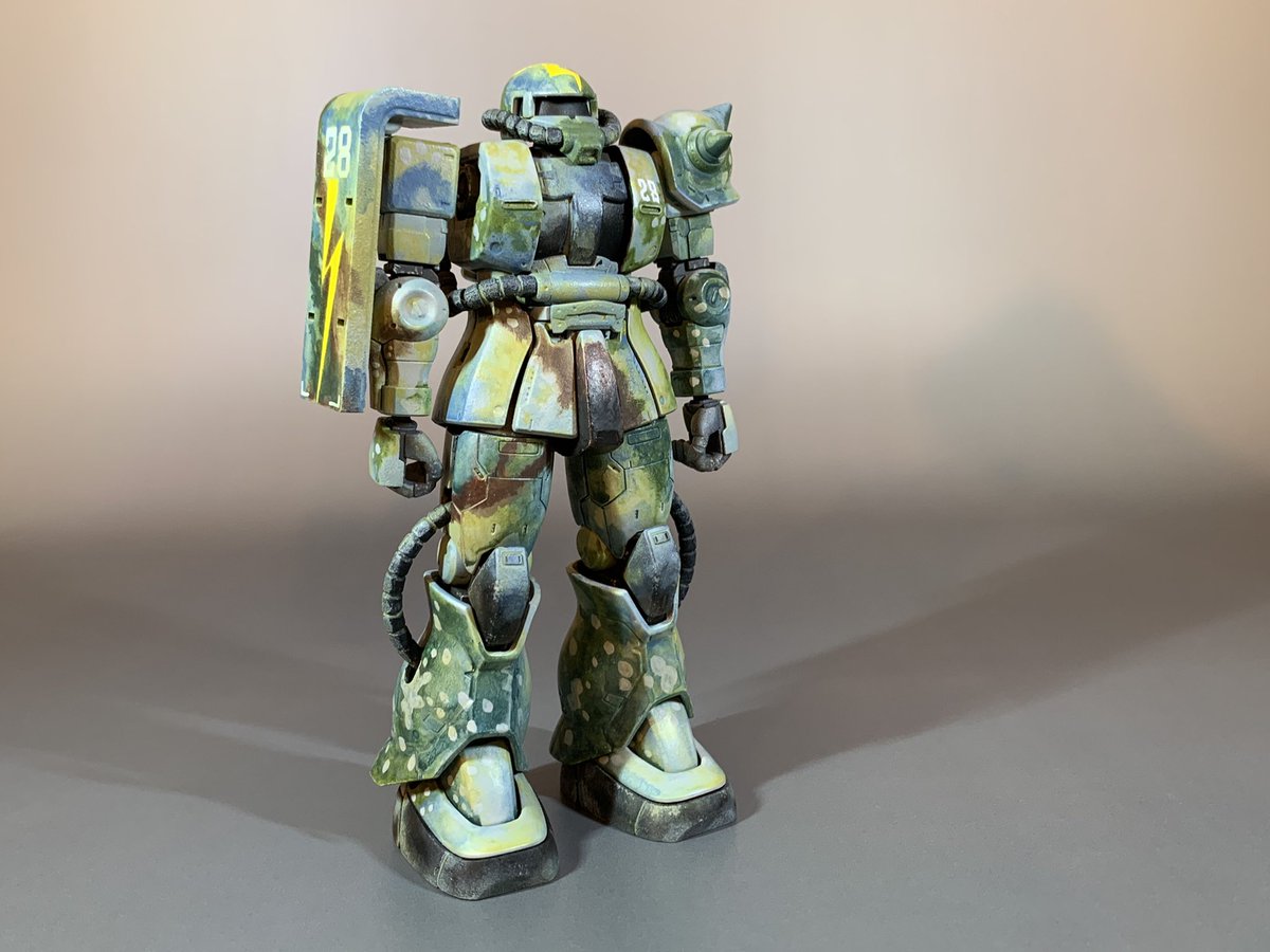 HGオリジン・ザクⅡを高荷義之先生の画稿風の砂漠迷彩カラーに塗装しました🤓タミヤアクリルを溶剤の表面張力を利用した筆塗りで、ボカした感じに何色か重ね塗りしました🤗 👇製作動画を見てみて下さいまし👇 youtu.be/0stjKfurUaQ #ガンプラ好きな人と繋がりたい #ガンプラ #高荷義之 #シボブラ