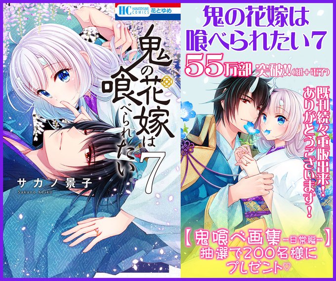 🌸花とゆめ🌸【#鬼の花嫁は喰べられたい】第7巻本日発売! おかげ様で㊗️55万部突破🌟 いつもお楽しみ応援下さっている皆様ありがとうございます❣️同時発売花とゆめ巻頭カラーにて登場✨ \プレゼント企画実施中🎉/ 【鬼喰べ画集-日常編-】 詳しくは帯をご覧ください。 どうぞよろしくお願い致します!