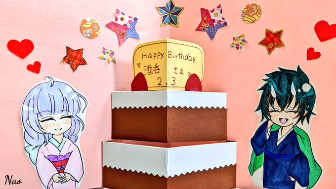 🎉🎂Happy Birthday 酒呑❣️🎂🎉 2月3日は鬼喰べの酒呑童子の誕生日❣️(≧∇≦)💕 今回は、飛び出すバースデーカード風のイラストにしてみた。(*^^*) #鬼喰べ #鬼の花嫁は喰べられたい #酒呑童子生誕祭2022