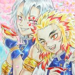 以前描いたイラストをリメイク。酔っ払いコンビ(笑)煉獄さんは「うまいっ!うまいっ!」の表情で。 #鬼滅の刃 #鬼滅の刃アニメ3周年 #鬼滅の刃イラスト #宇随天元 #煉獄杏寿郎 #鬼滅の刃好きな人と繋がりたい