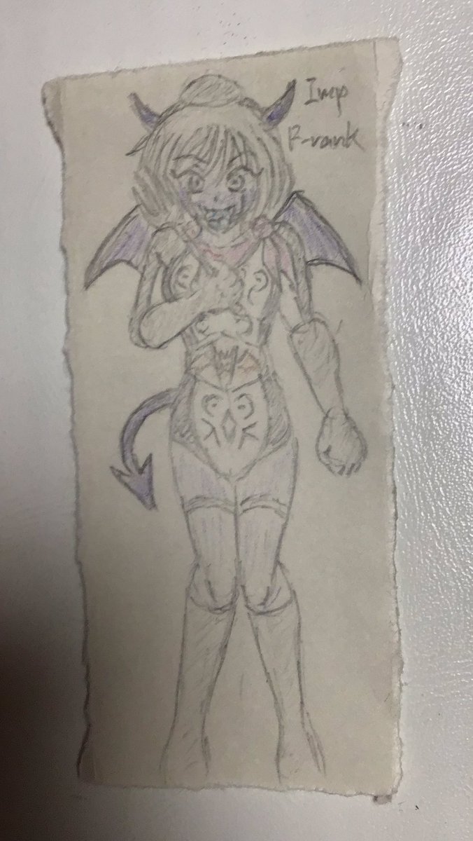 〜魔王軍戦闘員図鑑〜 種族名:インプ ランク:Fランク 系統:魔族系 所謂小悪魔。悪知恵が少し働く。 多くは中級悪魔に使役されている。 魔法も使えるが数回が限度である。 #魔物娘 #女戦闘員 #お絵描き好きな人と繋がりたい