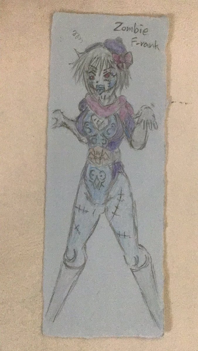 〜魔王軍戦闘員図鑑〜 種族名:ゾンビ ランク:Fランク 系統:アンデッド系 魔力によって動く死体。 体力と攻撃力に定評がある。 炎系の攻撃が弱点である。 #魔物娘 #女戦闘員 #お絵描き好きな人と繋がりたい