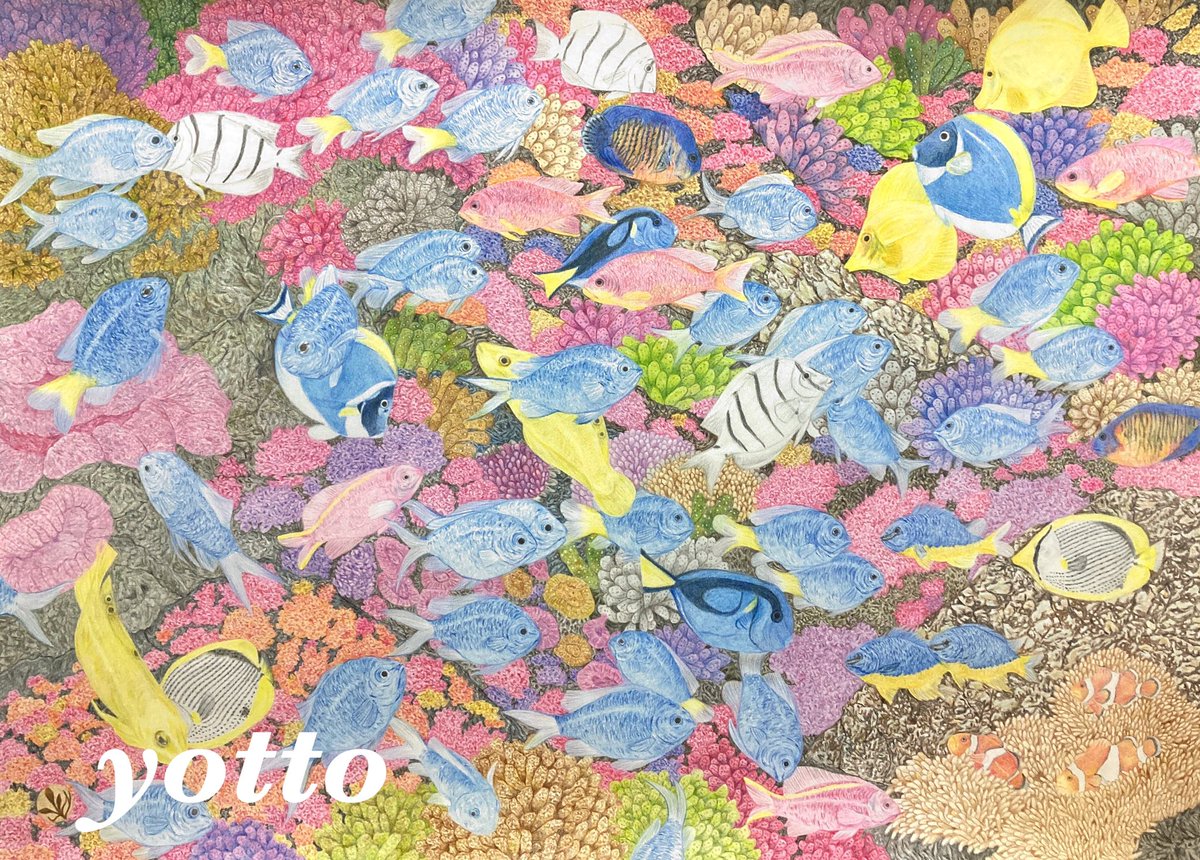 やーっと完成しました! 大好きなパラオ海🇵🇼 海中の多様な色合を出すために、40色以上の絵具を組み合わせて描きました。 作品の中には12種類の魚が泳いでいます🐟 #絵描きさんと繋がりたい #絵 #イラスト #ダイビング #魚 #スキューバダイビング