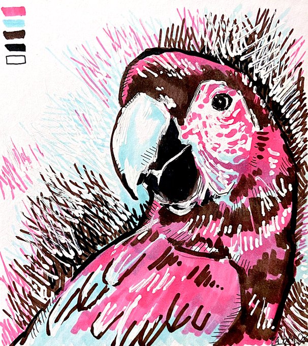 コンゴウインコの5色着彩(ピンク、水色、茶色、黒白)です。本来の色がかなり鮮やかなので色を絞ると印象が変わりますね。 #鳥 #鳥イラスト #絵描きさんと繋がりたい #絵柄が好きって人にフォローされたい