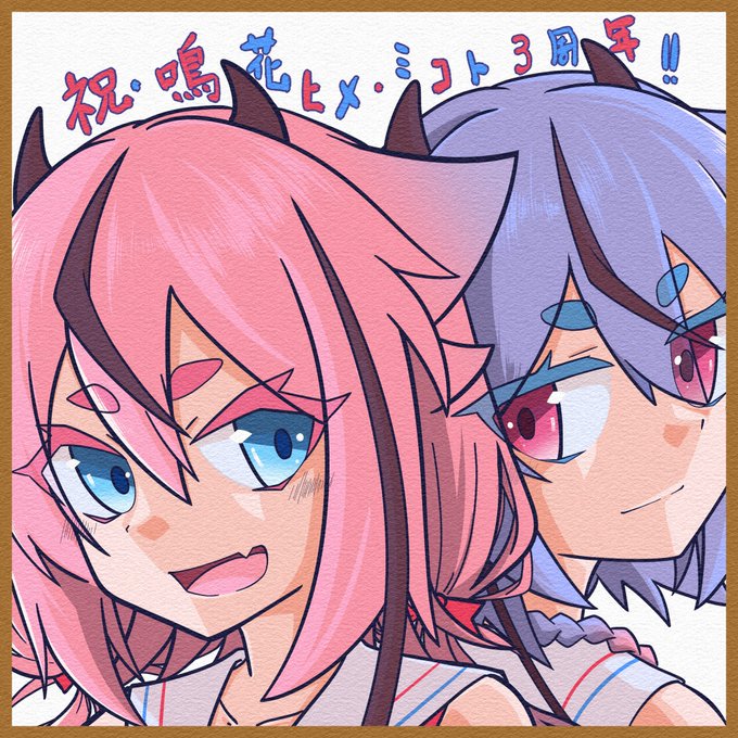 ㊗️🎊鳴花ヒメ・ミコト3周年🎊㊗️ 3周年イラストのラスト1枚を受け取ってくれえええ‼️ 最後の1枚は色紙っぽくデザインしてみました❗️ こんなへっぽこ動画投稿者の私にコレからも力を授けておくれ😇😇😇 4周年に向けて全力でヒメミコ推していこうと思います👹😈 #鳴花生誕の宴2022