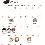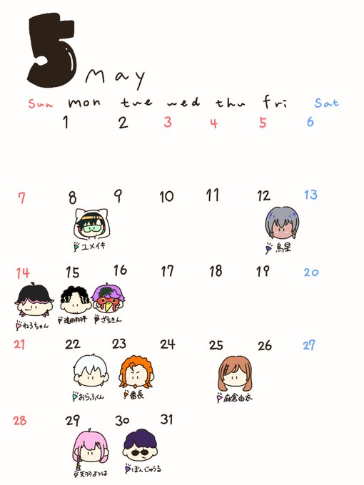 5月バースデーカレンダー🗓️ 今月はお誕生日いっぱい! あだ名からお名前(敬称略)に変えました! お誕生日おめでとうございます🎉 #ユメイキャンバス #烏bosi #みてみてねろちゃん #しょー壁画 #ざちきんのいらすと #見るかもわからん #番画 #麻倉アート #よつはがき #ぼんさん何してんすか