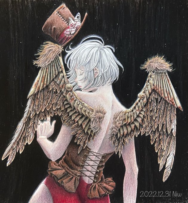 年内滑り込み! 「ヴィクトリアン幻想図鑑」より「飛行少女幻想」を塗りました。 実力不足で難しかったけど、やりたかった表現に挑戦し、頑張りました😊 今年は好みの素敵な塗り絵本に出会えて、喜ばしい限りでした。 作者様、出版社様ありがとう! #黒イ森ぬり絵ブック #大人の塗り絵 #色鉛筆