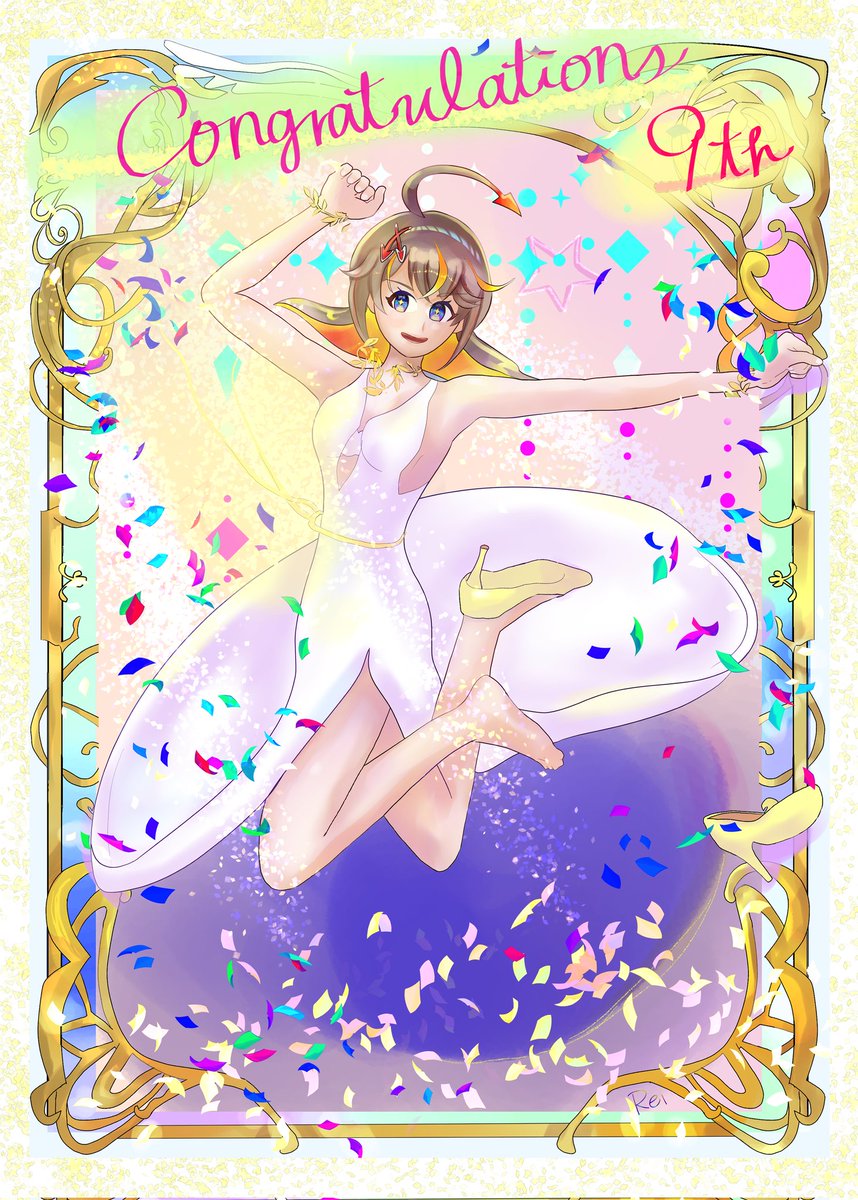 #黒ウィズ9周年パーティーイラスト企画 アレスちゃんで参加させていただきました!アレスちゃんの特徴的な髪やお目々の表現は特に注目していただけたら嬉しいです💡 枠を作り飛び出して見えるように作ることで、元気いっぱいのアレスちゃんを表現したいと思いました😊地道にカードふう枠描きました…