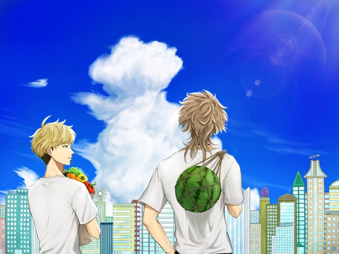 #黒ウィズFanArt_カレンダー企画 8月を担当しました。 ねっぷりだと鮮やかな青はしんでしまうと解っていたのにアホみたいに突き抜けた青空を描きたかった。 ふと気付いた夏に足を止めた🍷にどうしたのかと見やる☀️の、休日の買い出しの一コマです。 美味しそうに描けたかな(๑˃̵ᴗ˂̵))🍉 twitter.com/shino_wizclaim…