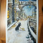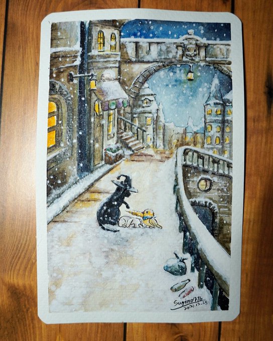 黒猫とウサギの冒険に小鳥も参加した。転んだウサギに、優しく守ってる二人の姿、いくら雪が降っても、このクリスマスは暖かい。 #水彩画イラスト #水彩画 #watercolorpainting #watercolor #創造画 #黒ネコ #ウサギ