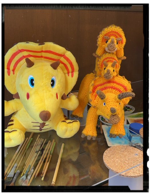 私のあみぐるみトリケラトプスも展示してありますので、ご来店できる方は是非!!1ヶ月程展示されるようです。 (公式様からお写真頂いちゃいました❤ありがとうございますーヾ(*´∀`*)ノキャッキャ❤) #あみぐるみ #黒川みつひろ #恐竜トリケラトプス #トリケラトプス twitter.com/komineshoten_/…