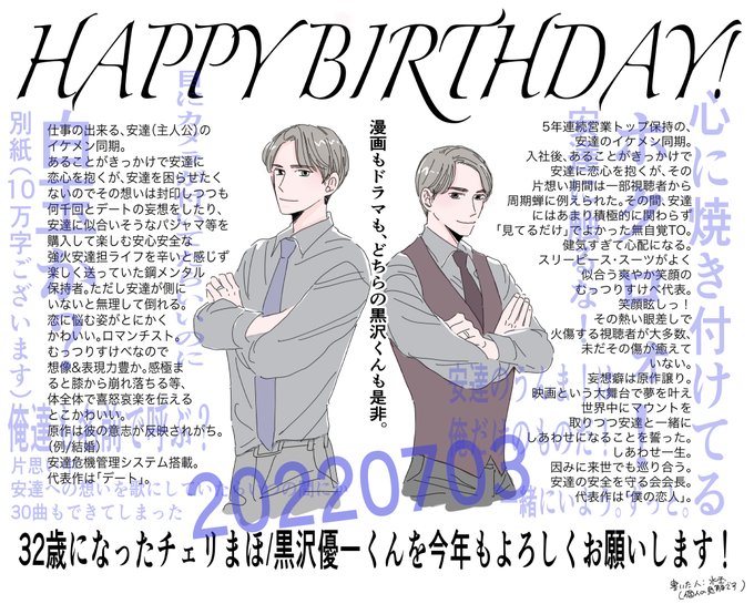 黒沢さんお誕生日おめでとうございます🎂🎉沢山の人にお祝いされて素敵な一日になったらいいな✨そして安達くんと一緒にこれからも楽しく幸せな日々を過ごせますように☺️🙌 #黒沢優一2022誕生祭