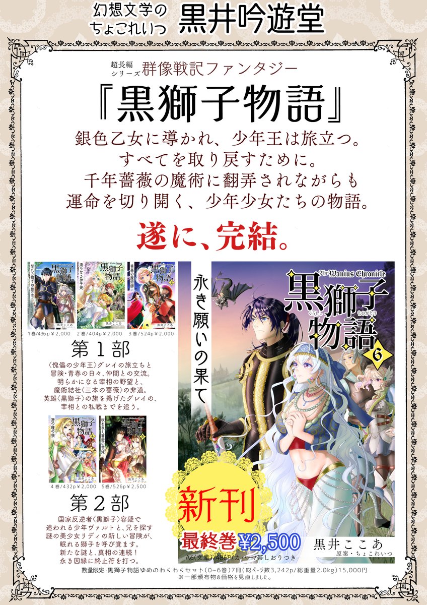 素晴らしいファンタジーは 時を越えて輝き続ける。 そんな王道を残した先人への 憧れと尊敬を込めて謳い継ぎます。 正統派エピック・ファンタジィ #黒獅子物語、全6巻ここに完結。 黒獅子の生き様を、あなたはきっと忘れない。 11/21(日)#COMITIA138【H26b】 11/23(火・祝)#文学フリマ東京【キ-02】