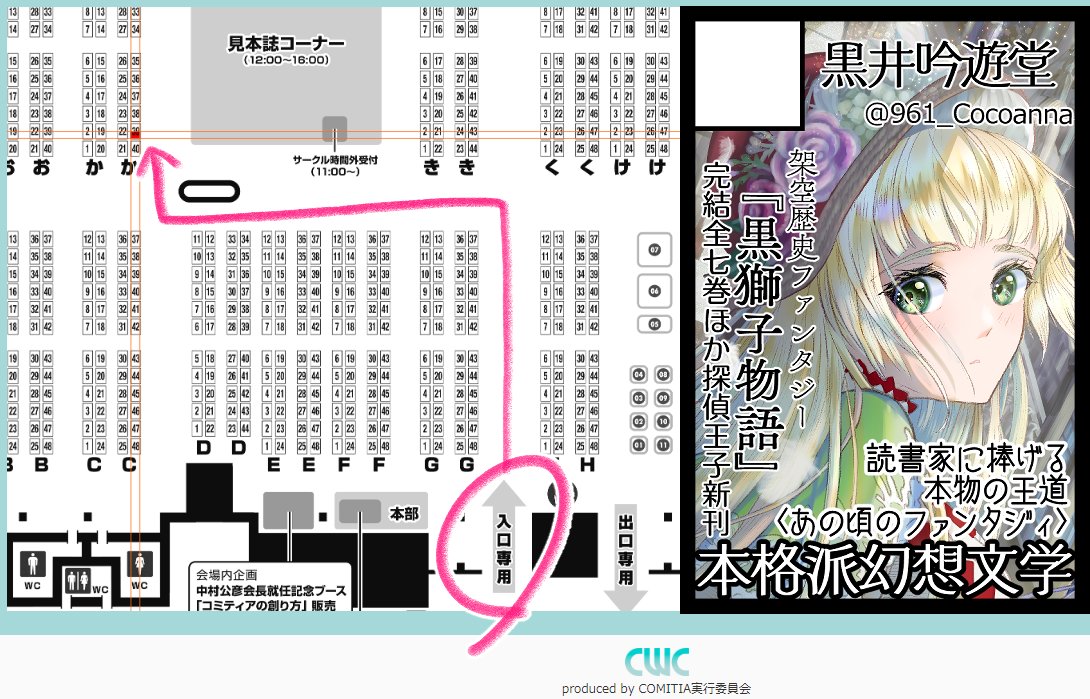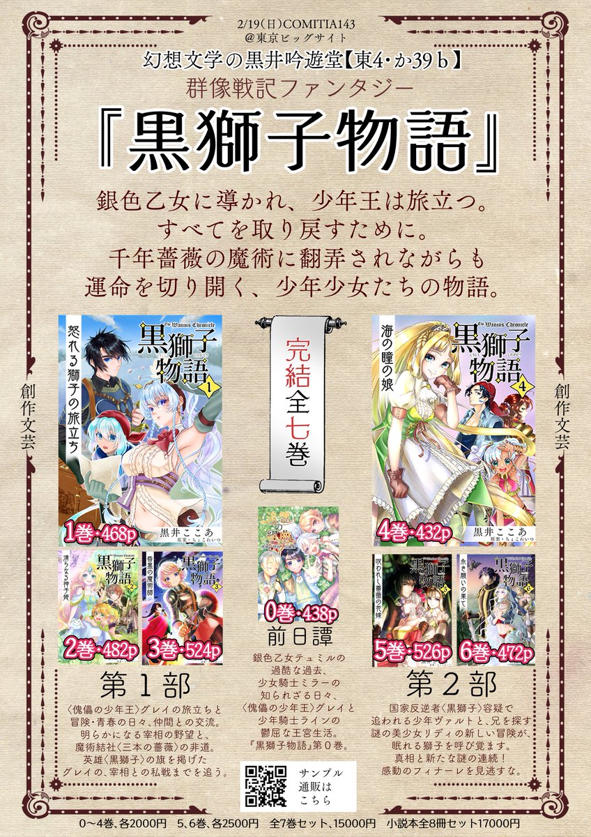 2月19日(日)東京ビッグサイトで11時から開催、#COMITIA143 に参加。 少年王が国を取り戻す群像戦記『#黒獅子物語』完結全7巻筆頭に新刊は一冊読み切りスチームパンク幻想ミステリ『探偵王子とシルフィード』。14時30分早退予定。 『本』物のファンタジー小説なら、黒井吟遊堂【か39b】