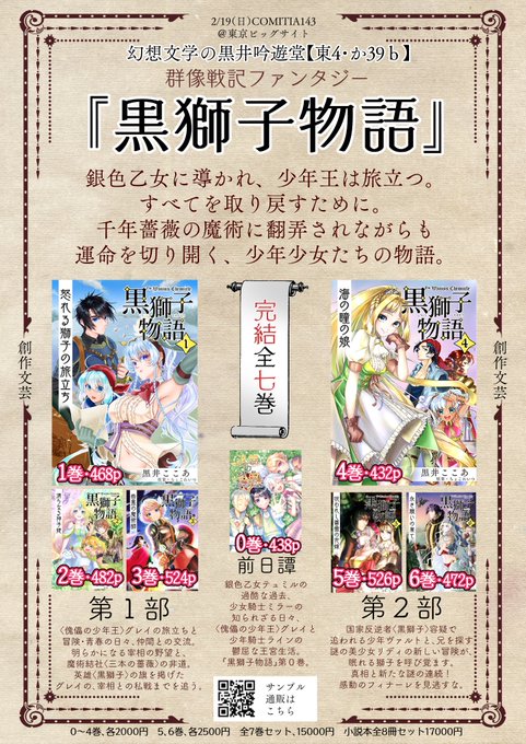 #COMITIA140 お品書きです。”吟遊詩人”作家の紡ぐ宰相に叛逆する少年王たちの群像戦記、JRPG好きを呻らせる本格ジュヴナイル。歴史ファンタジー小説『#黒獅子物語』完結全7巻ほか、#コピック 直筆色紙など。#エアコミティア140 #エアコミティア_文芸 #エアコミティア_通販 →961cocoanna.booth.pm