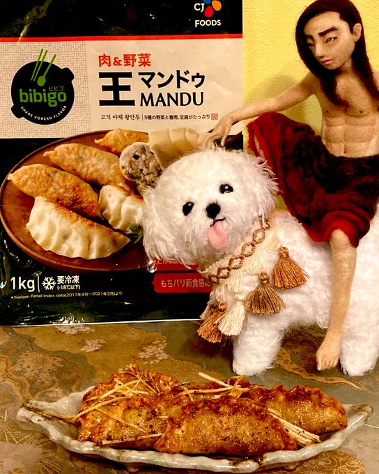 #パクソジュン さん出ているCMの…#bibigo の冷凍餃子は大きめでたっぷり❣️いろいろなアレンジ料理が楽しめます🥰焼き餃子、餃子スープ、残りは…揚げ餃子にして白髪ネギと甘辛酢醤油のタレに絡めてみました❣ソジュナ人形と共に😁 #おうちでbibigo #花郎 #박서준 #parkseojoon #羊毛フェルト