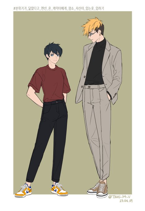 #분위기가_닮았다고_멘션_온_캐릭터에게_평소_자신이_입는옷_입히기 일본에서 "한국풍"이라고 불리는 남성 패션을 좋아해서 그런 옷만 입고 있습니다. twitter.com/Abyss_commi/st…