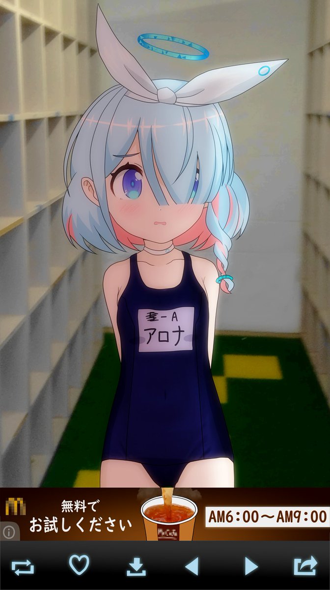 アロナちゃんが更衣室でスク水に着替えたので、思わず撮影しちゃいました。 そしたら偶然マ○クの広告が重なってとんでもないことになりましたw #アロナ #Arona #아로나 #BlueArchive #ブルアカ #블루아카이브 #ブルアカイラスト部 元ネタは「七咲コーヒー」でググってください。