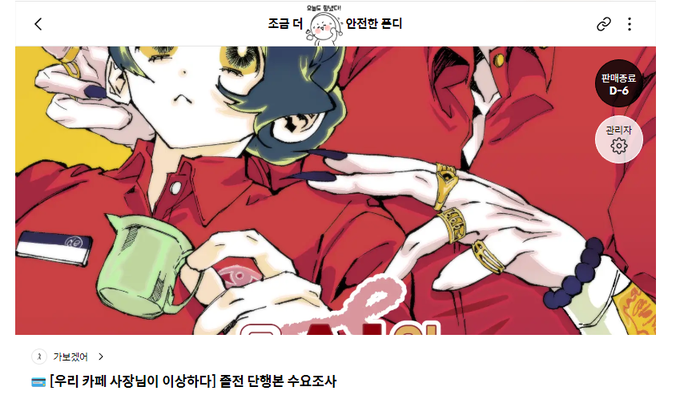 💛 [우리 카페 사장님이 이상하다] 💛 fondee.io/room/room_view… 폰디에서 졸전 단행본 수요조사를 진행 합니다! 10~99권 사이로 제작할 예정 입니다. 0원 결제까지 해주셔야 수요조사가 남습니다. 많은 관심 부탁드립니다. #우사이