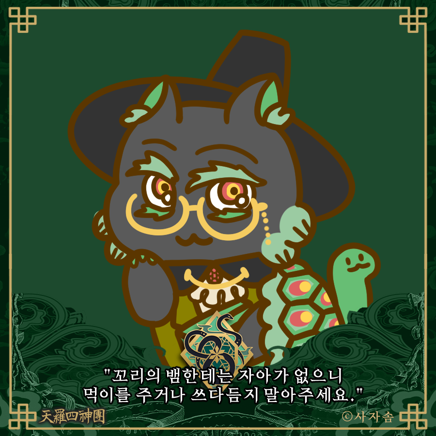 천라사신단 프로젝트에 사방신 일러스트로 협력하게 되었습니다! #천라사신단_사방신AU 1. 진명(眞名) | 녹수(綠水) 2. 소속 사신단 | 현무 3. 나이 | 연령 미상 4. 키 | 20cm 5. 한마디 | "꼬리의 뱀한테는 자아가 없으니 먹이를 주거나 쓰다듬지 말아주세요." 6. 특징(特徵) | 겉도 속도 새카매요