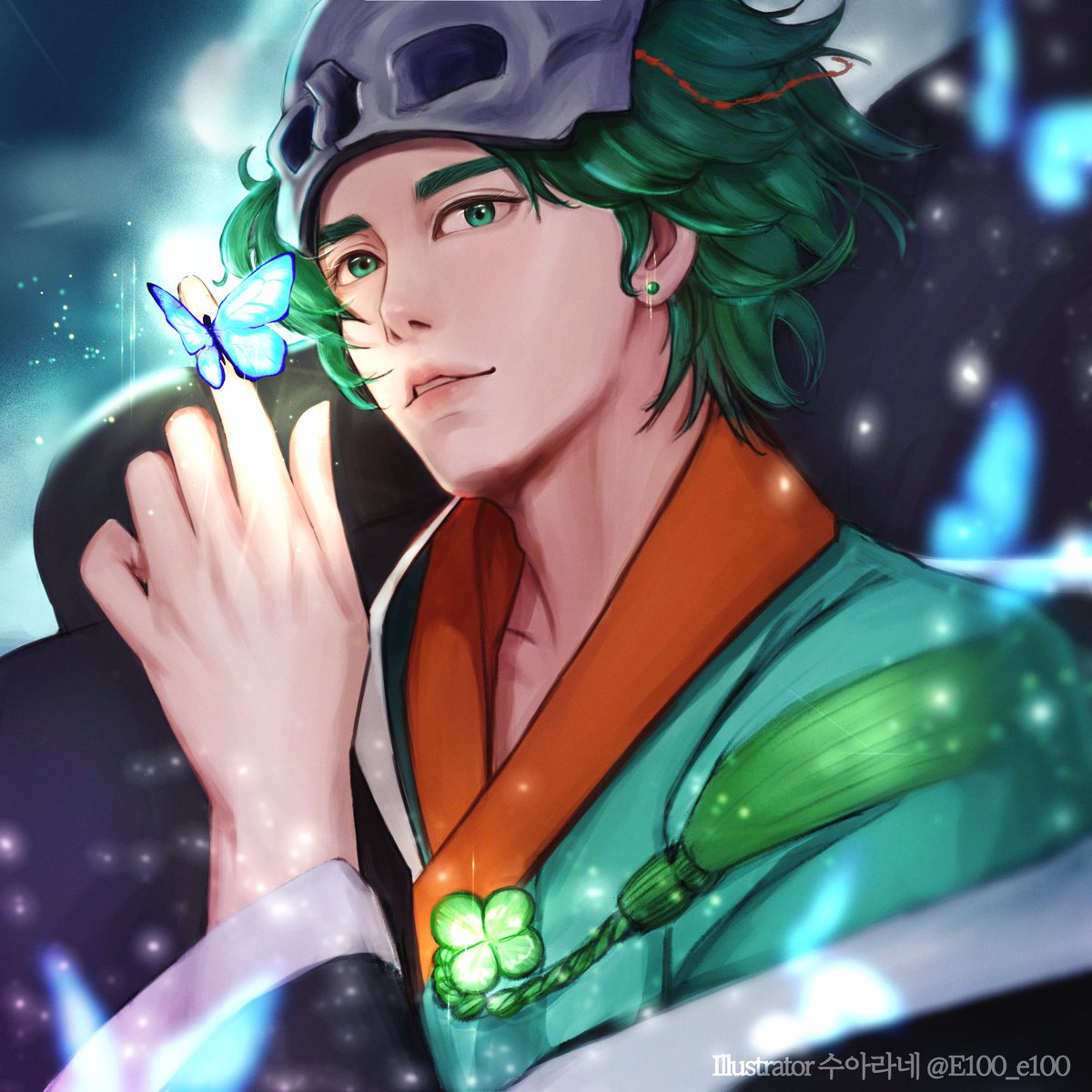 #콕카스_이모지_합작 🍀🦋✨💀 [길을 잃은 순간 푸른 나비를 만났다면, 당황하지 말고 그를 따라가라. 조금 게으르고 우울한 그가 너를 마중 나간 것이니.] 1년하고 5개월만에 다시 그려본 4모지 자캐, 저승이를 그려보았어요🤭