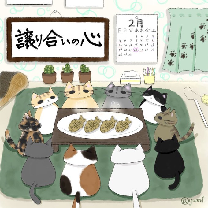 『どうやって分けようかにゃ…』 さぁ〜始まってしまいました!猫会議!🐈⬛🐈 今日はにゃんにゃんにゃんの日だから、ニャンコ集めたはいいけど、たい焼きの数足りなかった〜😂ごめんにゃさい🐾😹 #今日は何の日 #2月22日 #にゃんにゃんにゃんの日 #イラスト #illustration