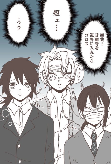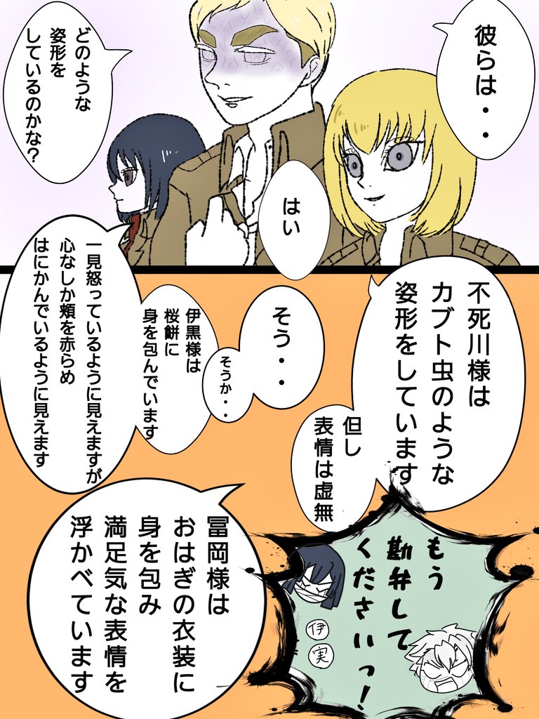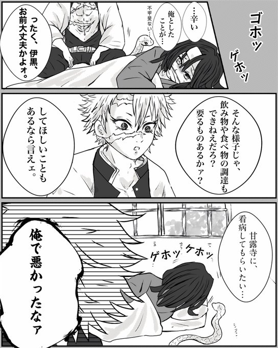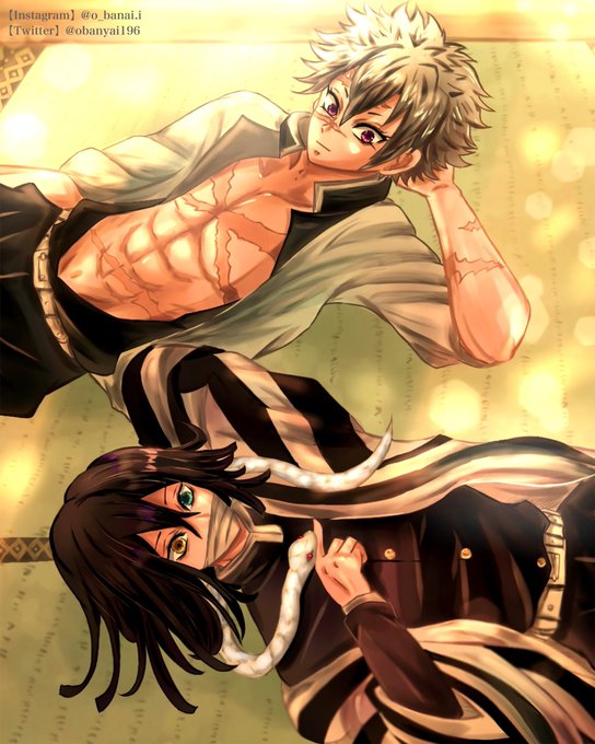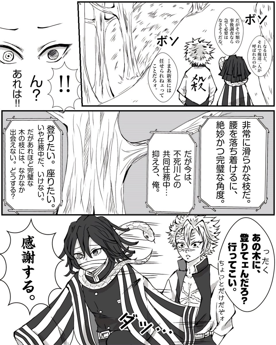 🐍「今日は好天だな。日向(ひなた)で読書でも楽しむとするか。不死i川も一緒にどうだ?」 🍃「風流だなァ。付き合ってやってもいいぜェ。」 …という会話を交わした10分後の映像。 #あなたの描くズッ友柱が見たい #21歳組