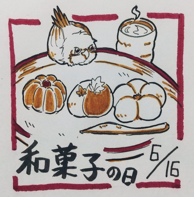 6月16日は和菓子の日🍡🍘🍵 和菓子は練り切りが可愛くて好き♥ #今日は何の日 #イラスト好きな人と繋がりたい #お絵描き #鳥 #一日一絵 #ペン画 #6月16日 #和菓子の日 #お絵描き好きさんと繋がりたい #日めくりカレンダー