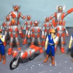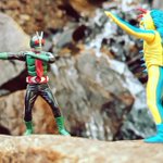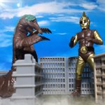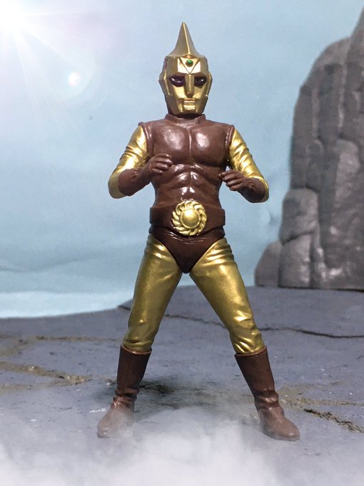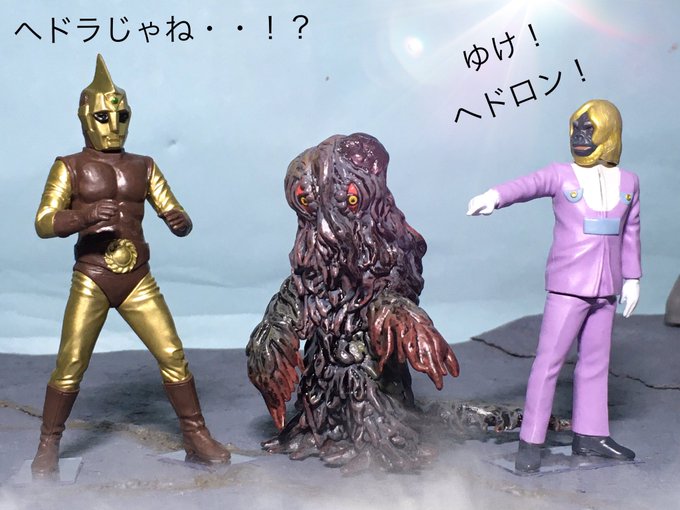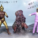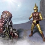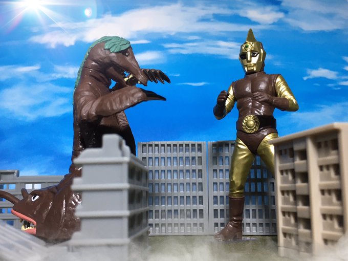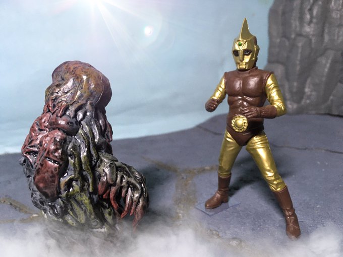 #夜のフィギュア撮影会 お題『フリー』 スペクトルマン対モグネチュードン! #スペクトルマン #モグネチュードン #HGシリーズ #HGスペクトルマン #Spectreman #ガチャ #ちいさな巨大特撮 #セキケンジ 氏 造型 #オモ写