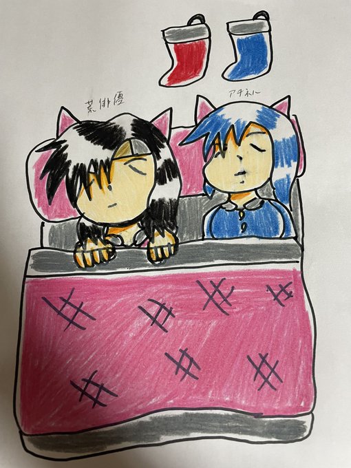 #一日一絵 #毎日絵一枚上げる #イラスト #色鉛筆画 #オリキャラ #イラスト好きな人と繋がりたい #絵描きさんと繋がりたい #クリスマスイブ 荒緋優とアチネルのクリスマスイブ 荒緋優とアチネルはクリスマスイブの夜に家で寝ていた サンタさんのプレゼントがもらえるといいね